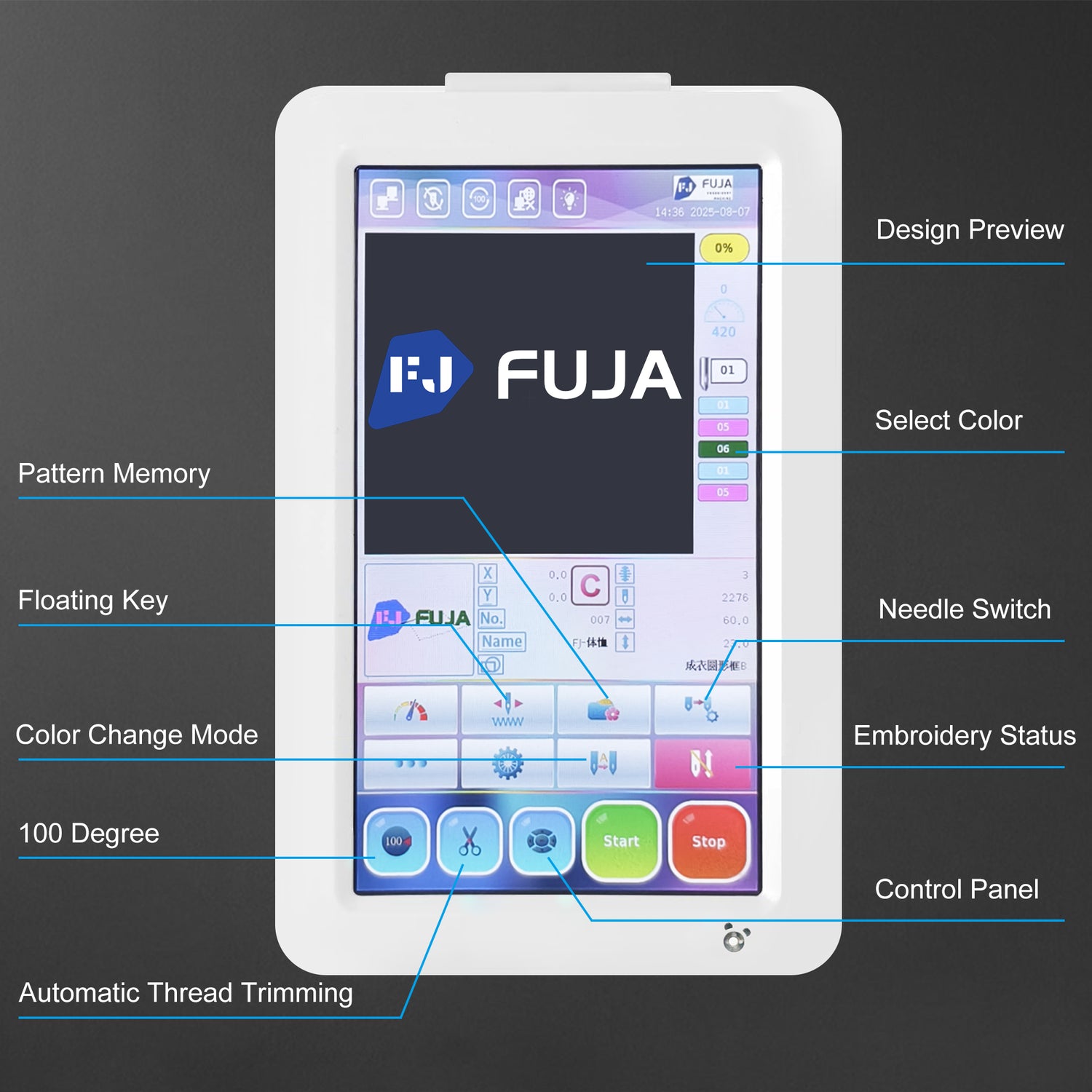 FJ-1501CS has auto thread trimmer, auto color change, auto bobbin winder function, the max. speed is 1200 SPM, it use 270° Cap Embroidery System. Serco motor 150W - lowest power consumption in the industry.