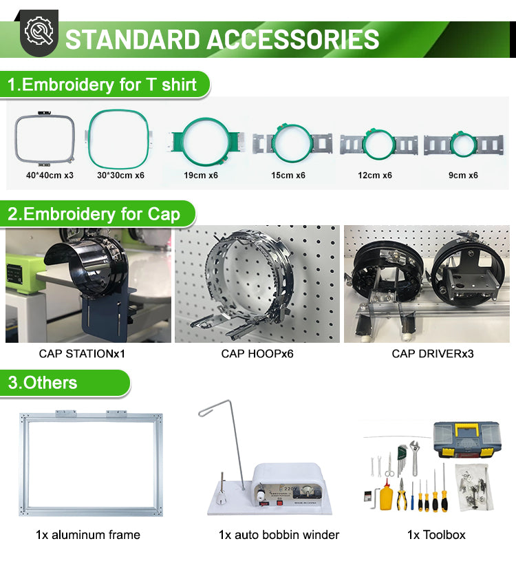 FJ-1501CS Single head embroidery machine, adopt high precision new type thread, offer 9,12,15 and 20 needles one head design. Suitable for flat bed, cap/hat, finished garments embroidery and more. Embroidery Machine Area is 350 mm x 500 mm.