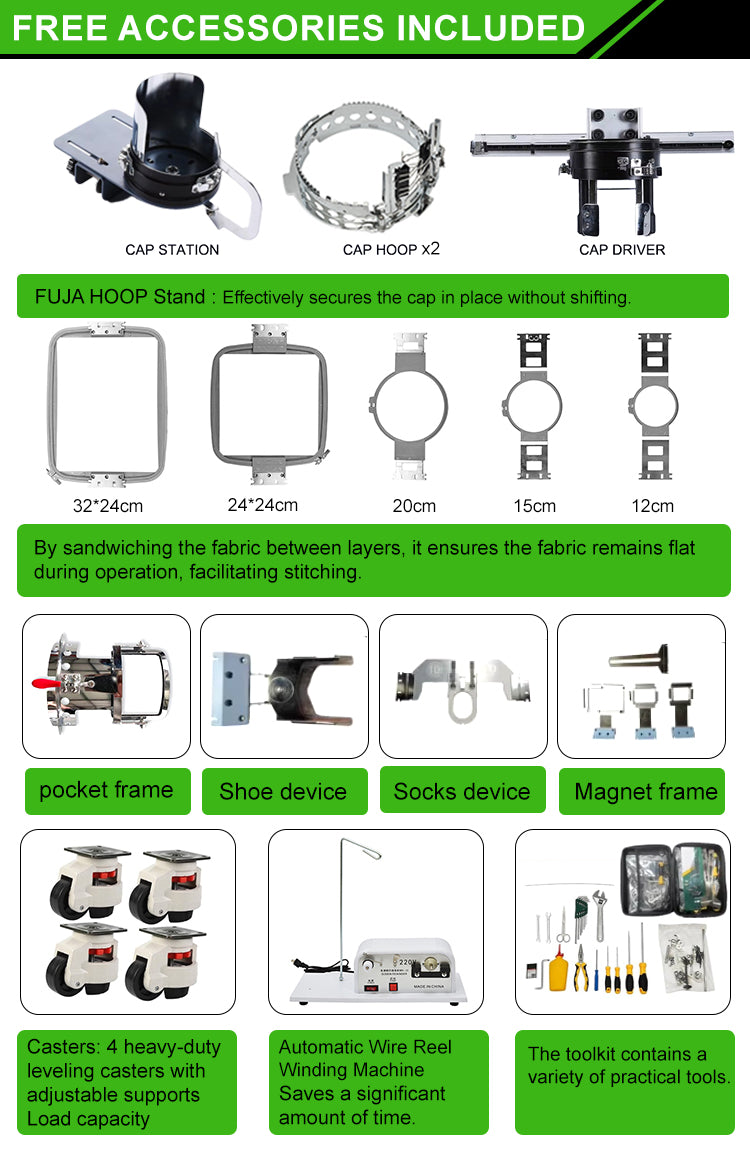 FJ-1501CS has auto thread trimmer, auto color change, auto bobbin winder function, the max. speed is 1200 SPM, it use 270° Cap Embroidery System. Serco motor 150W - lowest power consumption in the industry.